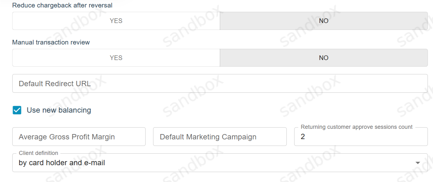 Customer Loyalty routing type is divided into endpoint, project, merchant, manager. Each of these levels has a Returning customer approve sessions count field that can be set for Managers by users with Superior role, while for Projects, Endpoints and Merchants - by users with Manager role. This value sets the number of transactions after which the customer will be considered “RETURNING”.