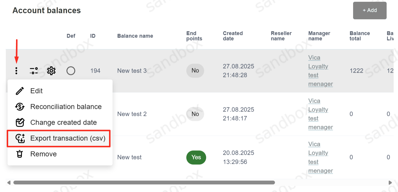To export all adjustments for specific balance press the Export button, specify period of time and after that press Export button. The csv file of adjustments will download automatically.